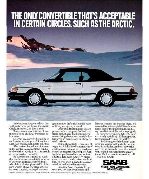 Ad description: Image of a Saab convertible against a snowy, Arctic backdrop. Headline: âThe only convertible thatâs acceptable in certain circles. Such as the Arctic.â