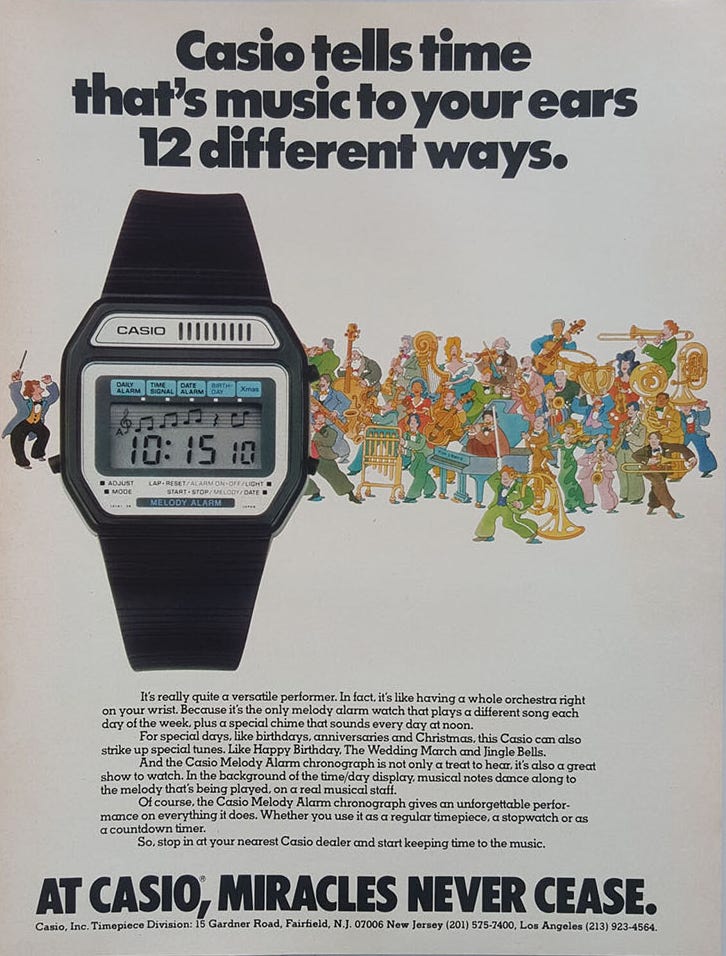 Then the body copy expands a bit more, “In fact, it’s like having a whole orchestra right on your wrist. Because it’s the only melody alarm watch that plays a different song each day of the week, plus a special chime that sounds every day at noon.”